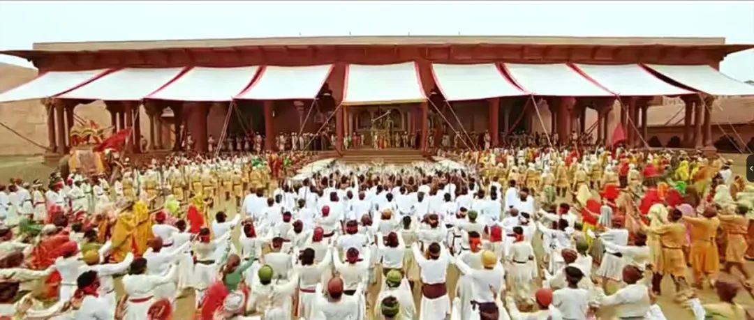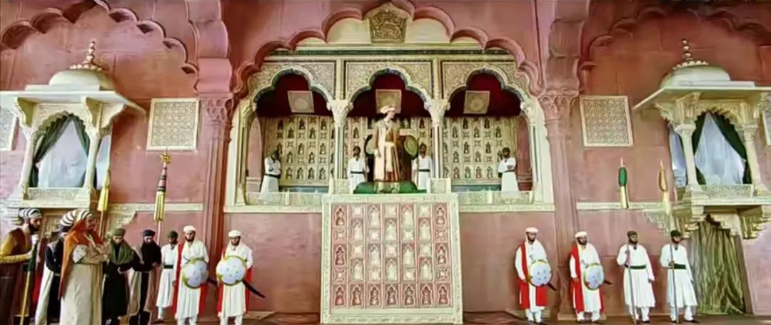 电影中表现百官朝贺、阿克巴宣布免除印度教徒吉兹亚税场景(向非穆斯林征收的人头税)的拍摄地是阿格拉红堡的公众觐见大厅,其地位相当于故宫的太和殿,是皇帝接见百官、朝臣觐见朝拜的地方,也是印度宫殿群的核心部分。建筑四面被回廊环绕,正中是皇帝的宝座“礼仪阳台”。皇帝正是在这里接见百官或发布指令。