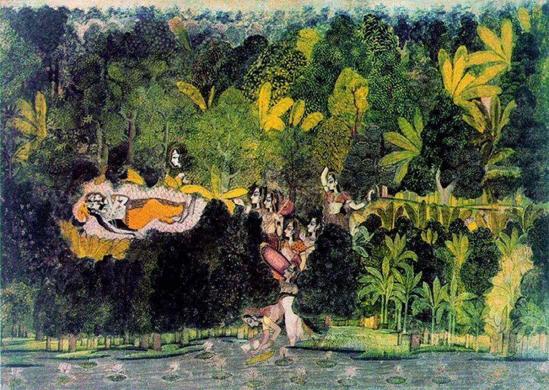 克里希那与罗陀的故事出自12世纪的颂歌《牧童歌》,很快便在印度广泛传播,在细密画兴盛的16世纪以降成为最受欢迎的绘画母题之一。特别是在喜马拉雅的山麓小国中,这类题材收到欢迎,国王和王后的形象也经常在绘画中被塑造成克里希那和罗陀,借用《印度艺术》中的描写——“罗陀和克里希那的浪漫的新景象在田园诗般的山脉和湖泊中间出现了”。在吉申格尔,国王辛格和他的情妇巴尼·萨尼化身克里希那和罗陀嬉戏于绿树和宫殿之间。画家尼哈尔·昌德用极为风格化的人物——锐利的面部线条、杏仁状的眼睛和弯弯的眉毛——创作歌颂爱情的抒情性绘画,充满印度教的灵性,与创作于莫卧儿宫廷的绘画迥然不同。