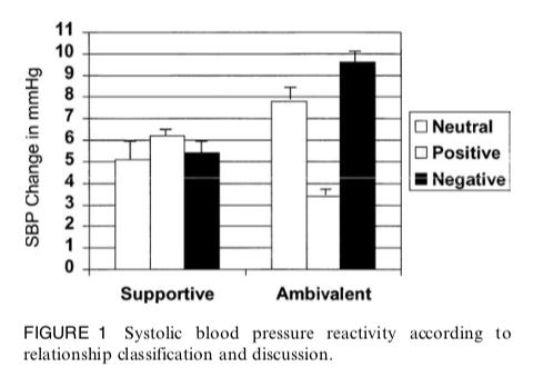 ▷ 与积极、冷漠和消极敌人相比,当参与者与友敌互动时,动态收缩压(SBP)最高。研究者的结论是:友敌所带来的矛盾关系,可能比单纯的消极性更有害比起明确的敌人,友敌更具破坏性的原因在于:他们会如何反应是「不确定」的。