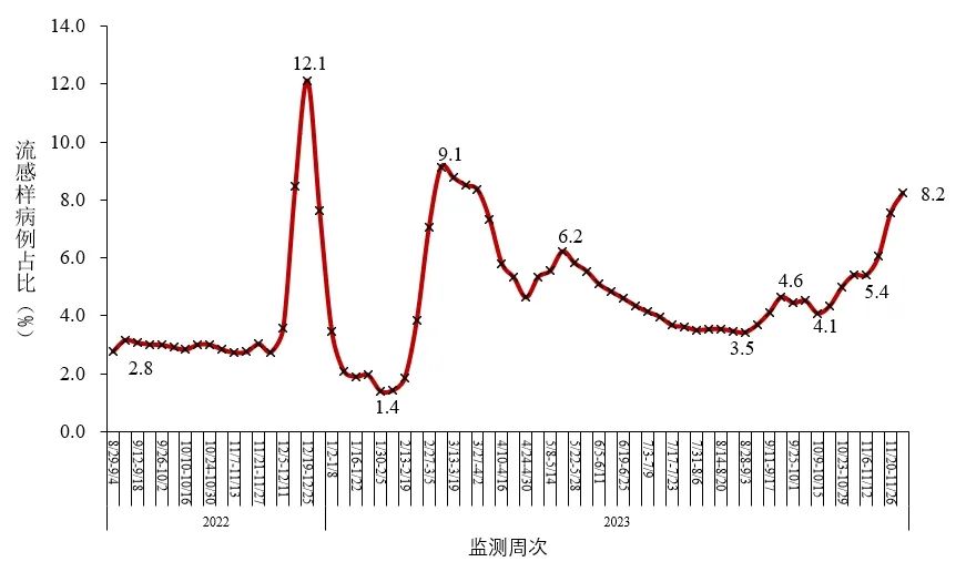 2023年11月1日-11月30日,全国哨点医院流感样病例占门(急)诊就诊人数比例持续增加。从2023年第45周(11月6日-11月12日)的5.4%较快上升至第48周(11月27日-12月3日)的8.2%。见图3-1。