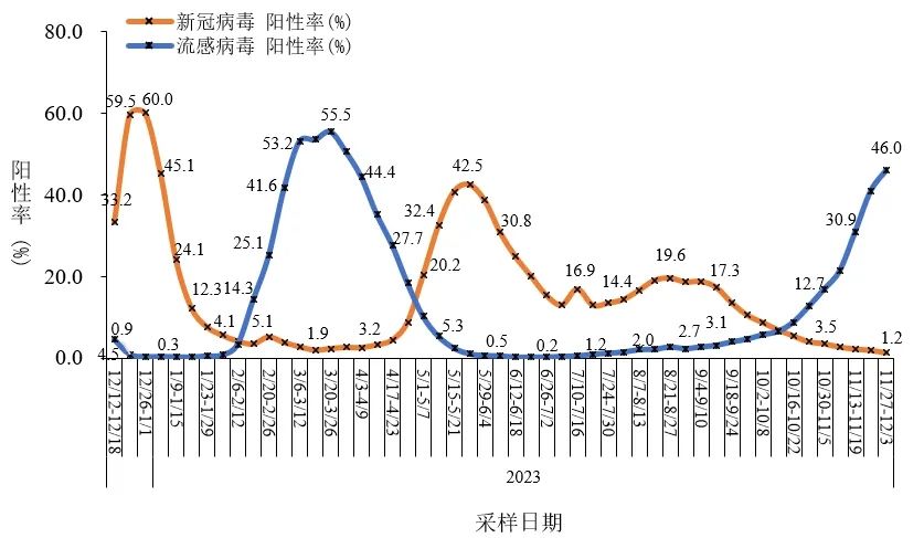 流感样病例新冠病毒核酸阳性率持续下降,从2023年第44周(10月30日-11月5日)的3.5%下降至第48周的1.2%。见图3-2。