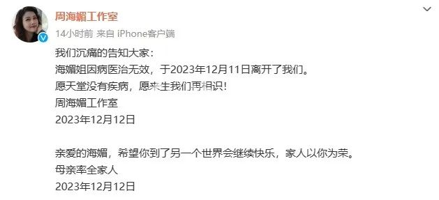 12月12日,周海媚工作室对外发布讣告,宣布周海媚因病医治无效,于2023年12月11日去世,享年57岁。