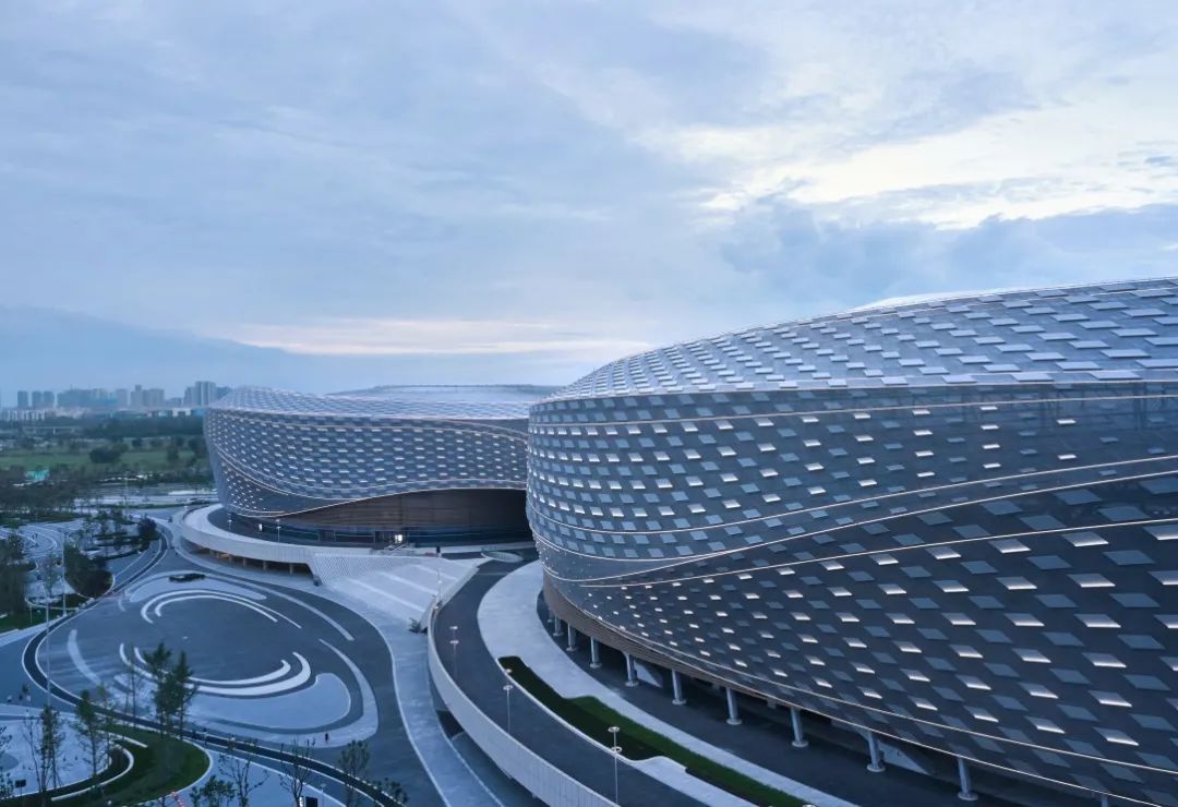 设计采用场馆合建策略,形成沿城市中轴展开、宏大而独特的地标;创新连接体育馆与足球场的空中俱乐部,提供新颖的观演体验。首创大开口索穹顶结构体系+单层ETFE膜罩棚,展现技艺之美的同时,达到轻盈通透的效果。仅用普通钢结构不到1/5的用钢量完成了大跨度技术需求,实现建筑、结构、气候、功能和谐统一的自然营造。