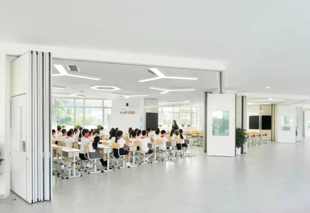教室单元选择创新的正六边形平面,匹配教室间及走廊侧的推拉活动隔断,实现弹性可变的单元与组团布局,高效应答蒙彼利埃小学领先的的“主题式教学”需求。