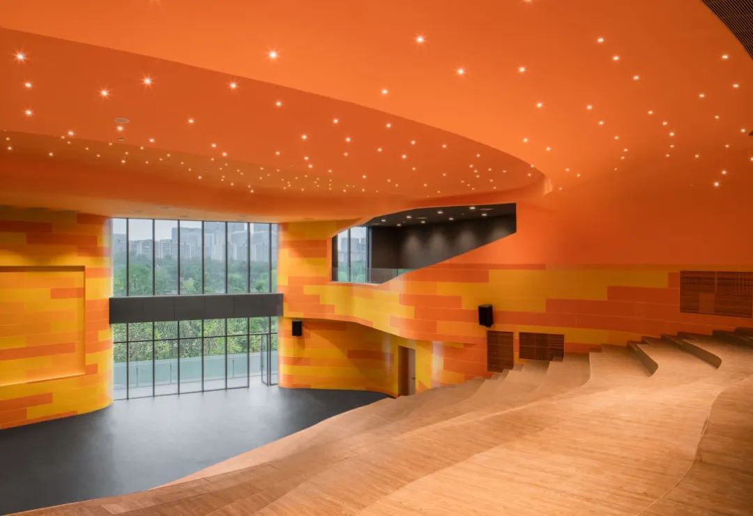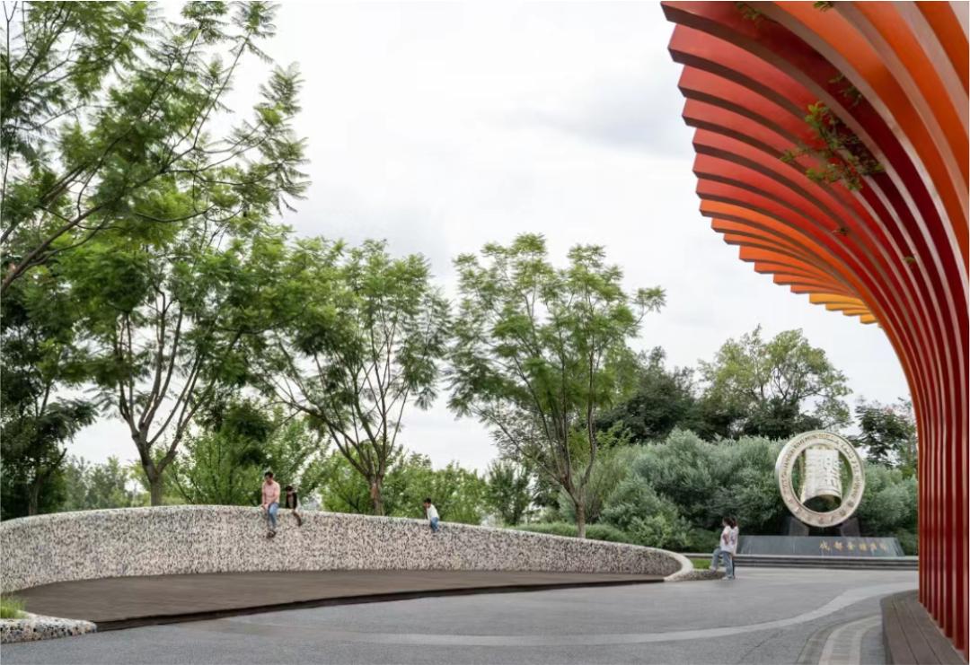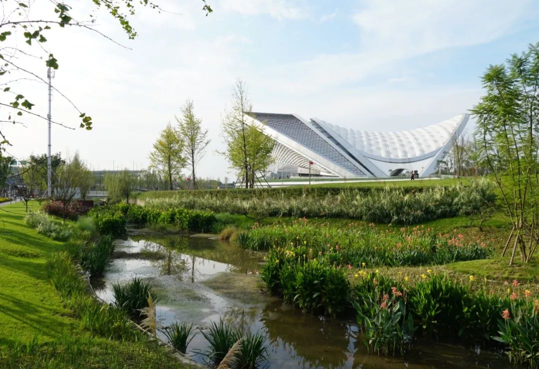 成都露天音乐公园占地31.8公顷,是以音乐文化为主题的生态公园和城市露天音乐圣地。公园地形设计结合声学建造,地表径流管理,场地管综统筹,数字化全过程建造、运维管理等措施形成多功能复合业态城市主题公园。音乐节时全效声的一主四副舞台,同时容纳4万人城市露天音乐会,设计通过声环境分析并结合内部地形参数化设计,利用主舞台两侧的人造坡地形成自然的隔音屏,主舞台跨度180米宽、45米高,形似凤冠,能承担1万人的半室内音乐会以及5000人的室内音乐会。公园有多个主题小舞台可以进行互动和表演,还拥有不同自然主题的五大露天剧场以及亲子乐园、极限运动场、五人制足球场等特色活动区,能满足全龄段市民的游玩需求,是2023年31届世界大学生运动会的闭幕式场地。