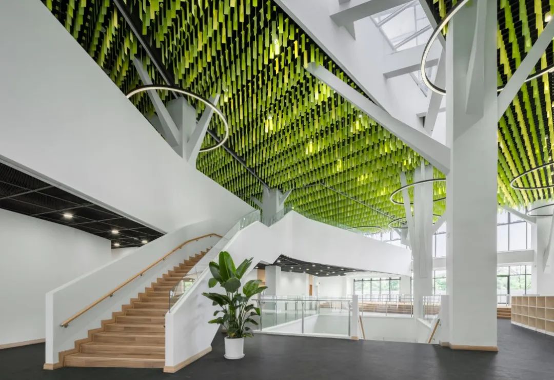 立面设计抽象而节制,在坡屋顶下,搭配木白二色,简洁大方,传递含蓄的书香韵味;用一种现代、含蓄的方式将中式空间的审美意趣浸润入校园的日常生活,融入同学们的空间认知与场地记忆。