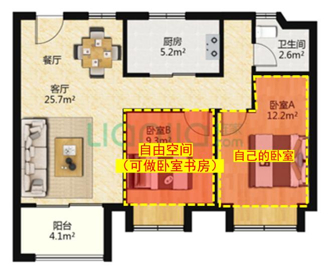 一个房间当主卧自己住,另一个留给偶尔过来的亲戚朋友住