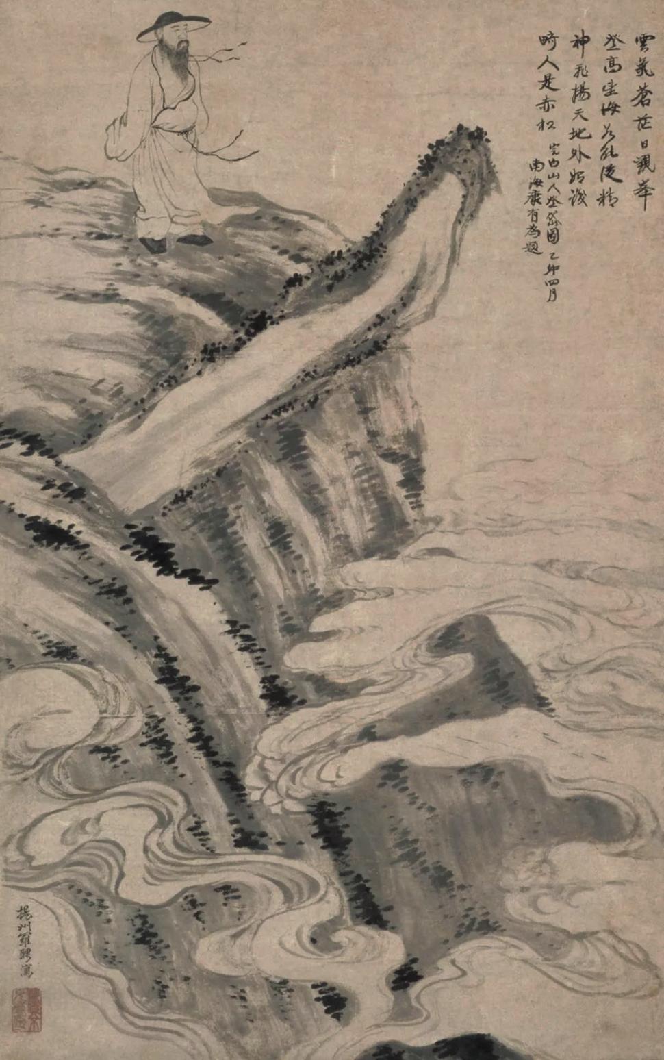 清·罗聘 《邓石如登岱图》轴(局部)泰山正南面有三谷。中谷绕泰安城下,郦道元所谓环水也。余始循以入,道少半,越中岭,复循西谷,遂至其巅。古时登山,循东谷入,道有天门。东谷者,古谓之天门溪水,余所不至也。今所经中岭及山巅崖限当道者,世皆谓之天门云(4)。道中迷雾冰滑,磴几不可登。及既上,苍山负雪,明烛天南。望晚日照城郭,汶水、徂徕如画,而半山居雾若带然(5)。