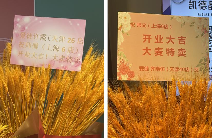 米村门店的店招是红色底、白色亮字,比较显眼。门口有很多红色包装、黄色大麦的花篮,其中有两个花篮来自天津26店和40店,两位徒弟祝师傅(上海6店)开业大吉,并没有具体提及师傅的名字,由此可以推测,米村拌饭内部的门店组织与扩张为 “师徒制”,鉴于其独特的“全直营”模式,师徒制能够在一定通过分成来激励员工、绑定利益,同时也为快速扩张提供了组织基础。