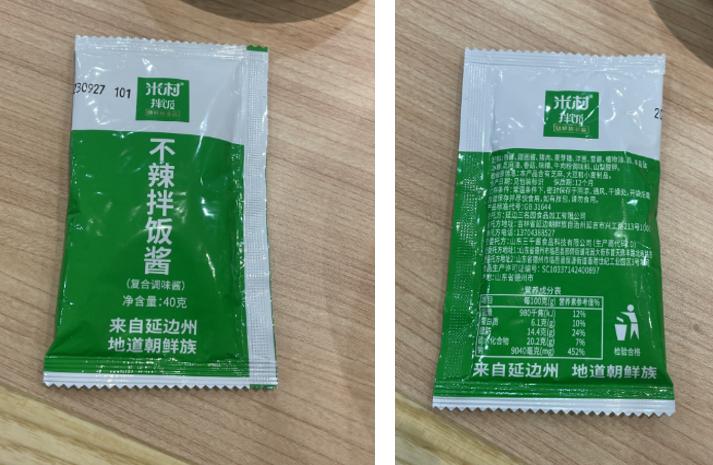 拌饭上桌时,托盘会放置包装好拌饭酱,辣的是红色酱包、不辣的是绿色酱包,由顾客亲手撕开酱包进行拌饭。其中,绿色酱包显示有净含量40克、生产日期是9月27日,由山东德州的一家食品公司代为生产。