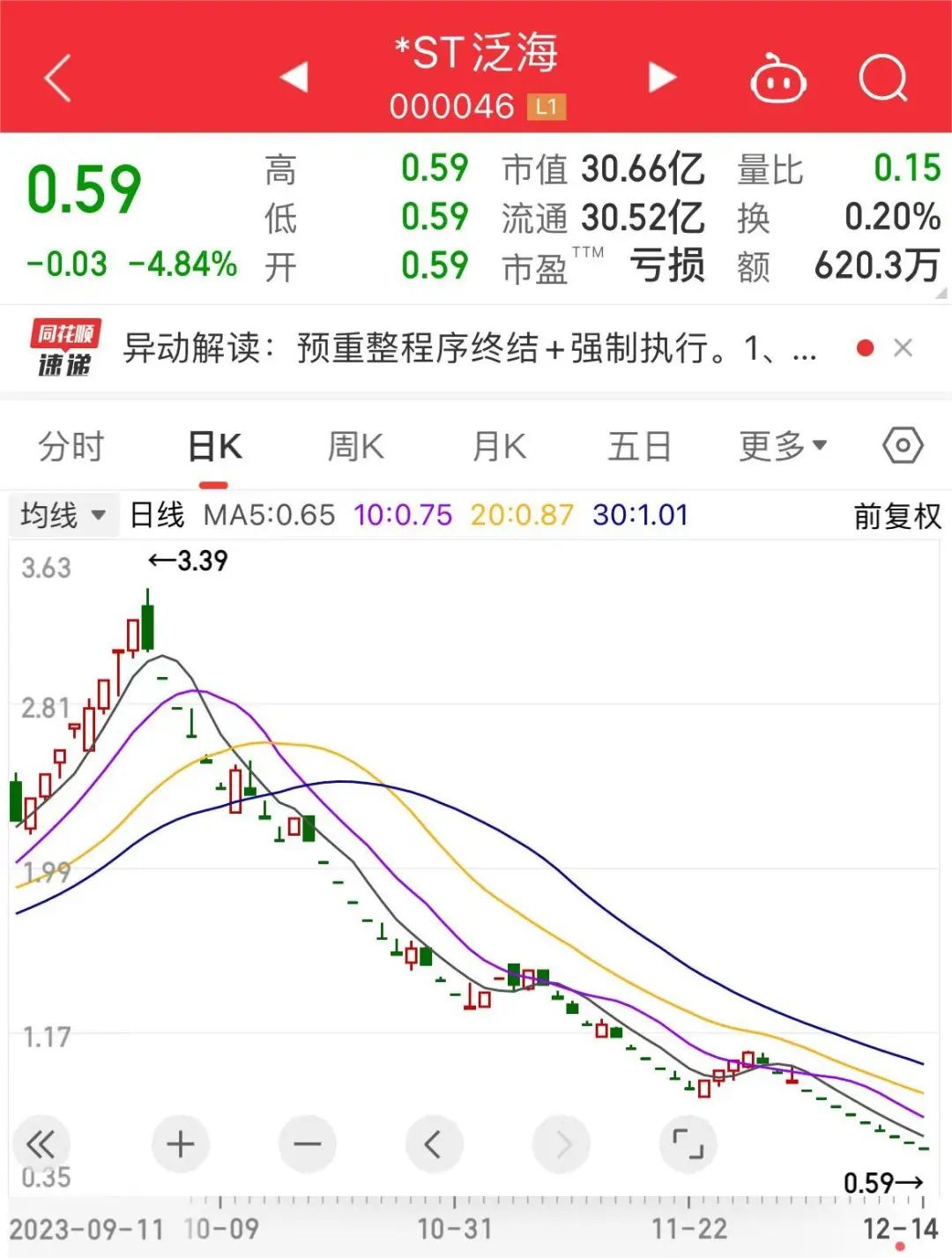 *ST泛海今日也拉响退市警报,截至收盘,*ST泛海报0.59元/股,最新市值约30.66亿元,股东户数为7.8万户。自11月30日以来,已连续第11个交易日收盘价低于1元/股,提前“锁定”1元退市。