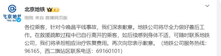 各位乘客,针对今晚昌平线事故,我们深表歉意。地铁公司将尽全力做好善后工作。在救援疏散过程中已自行离开的乘客,如后续感到身体不适,可随时联系地铁公司,我们将承担相应治疗恢复费用。再次向您表示歉意。(地铁公司服务热线:96165,西二旗站区联系电话:69160101)