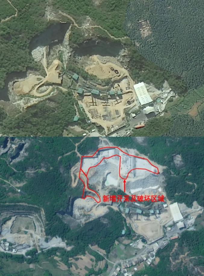 2020年与2023年惠安县两个矿山增加开采及破坏面积示意图。(督察组供图)