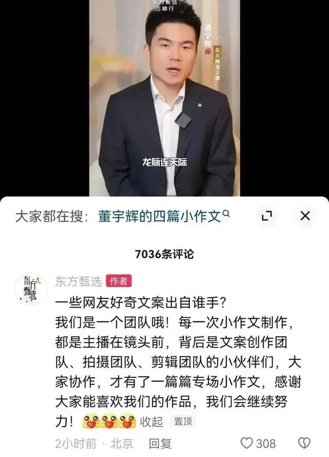 董宇辉最新回应。图源:董宇辉抖音他在回应中介绍了东方甄选的小作文创作模式,一是董宇辉本人创作,如西安场,内蒙场。二是董宇辉提供思路和建议,小编创作,双方讨论修改。三是小编自主创作小作文,董宇辉极少改动或不改动。