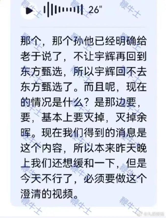 图源:鞭牛士此前,网传聊天记录里提到,“孙已经明确给老俞说了,不让宇辉再回到东方甄选,所以宇辉回不去东方甄选了。而且那边基本要灭掉,本来昨天晚上要缓和一下,但是今天不行了,必须要做澄清的视频”。