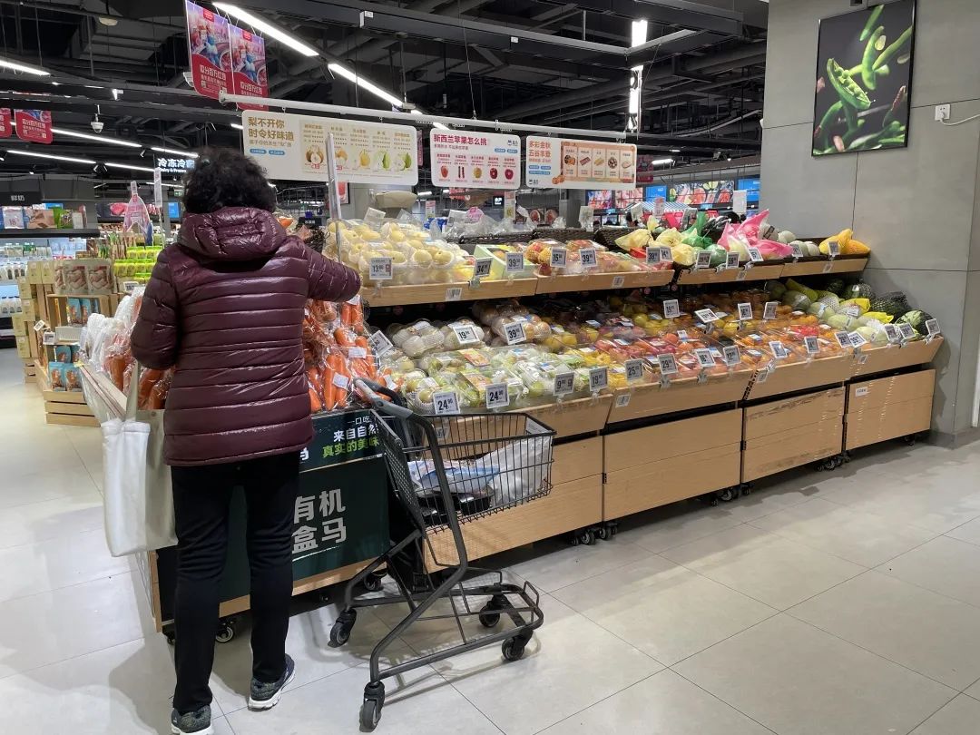 近日,记者走访位于上滨生活广场的盒马鲜生发现,除了常见的热带水果外,草莓、金桔、橙子等时令水果都被摆放在最显眼的位置,不时有市民驻足,在水果摊位前挑选一番。