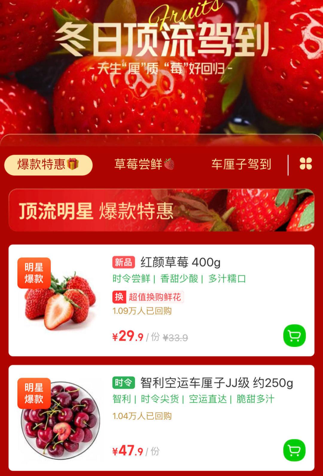 此外,记者还了解到,在叮咚买菜、盒马等生鲜平台上,当季时令水果也十分热销。其中,叮咚买菜为红颜草莓、智利车厘子、奶油草莓、进口蓝莓和冰糖秋月梨五款当季明星水果开辟了专栏,方便市民挑选;饿了么推出水果爆红包,让市民享受满减优惠。