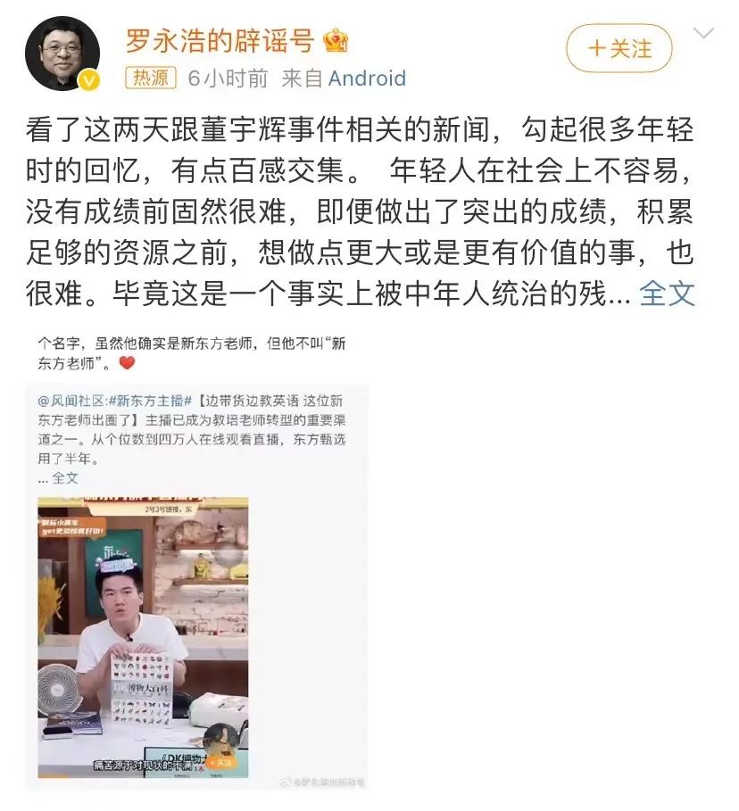 他发了条朋友圈评论董宇辉事件,先是共情董宇辉,然后批判了这个“木秀于林,风必摧之”的世界,最后表示如果董宇辉想创业,自己可以支持,“对我只是举手之劳的问题”。此举真应了网友的预测——董宇辉若是离开,大可投奔老罗。
