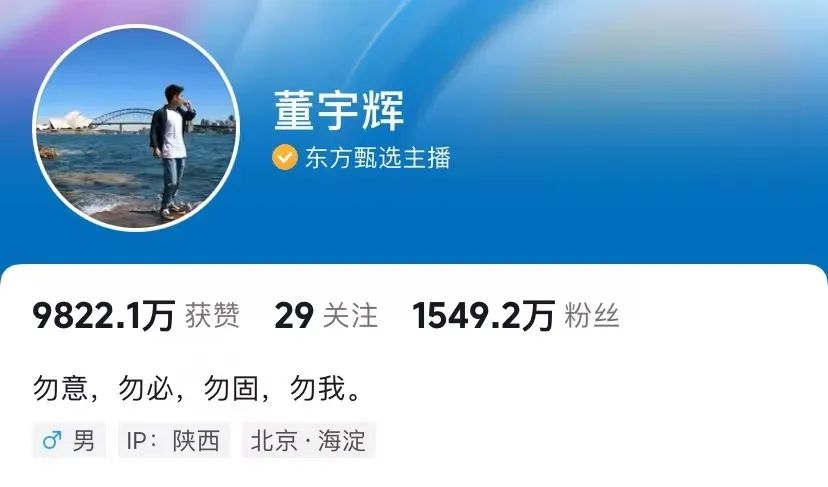 董宇辉抖音账号粉丝已过千万。(图/抖音截图)东方甄选请了写手团队去塑造和维护好这样的设定。这当然是再正常不过的公司行为。网红有其宿命。网红容易膨胀也容易凋零,所以才有了MCN,才有“不把鸡蛋放到同一个篮子里”的抗风险机制,才有了专业团队协作的必要性。