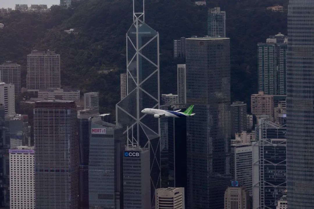 今日(16日),国家自主研制的C919飞机于上午10:30从香港国际机场起飞,由西至东进入及飞越维港上空,环绕香港岛两圈,进行飞行演示。现场所见,天色晴朗及有阳光,C919在维港上空翱翔,融入维港景色。C919先飞到南丫岛对出上空绕了数圈,至约10:50首度低空进入维港。