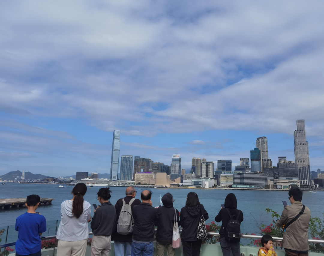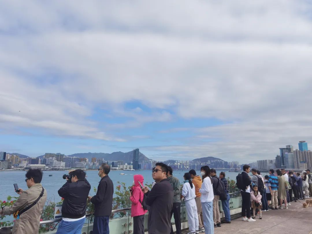 尖沙咀海岸旁,大批市民早早到场等候,当中有不少摄影发烧友及“飞机迷”架“长枪短炮”,拍摄C919进入维港上空的瞬间。