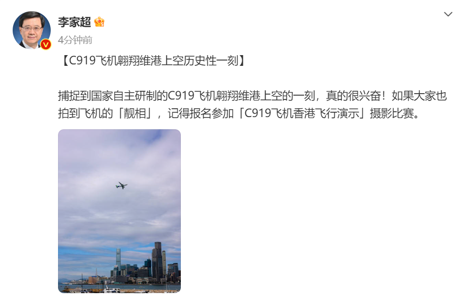 香港特区行政长官李家超今日在社交媒体发文表示,他捕捉到C919飞机翱翔维港上空的一刻,感觉很兴奋。李家超鼓励市民如拍到飞机“靓相”,可报名参加“C919飞机香港飞行演示”摄影比赛。