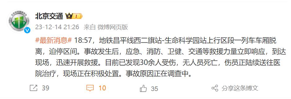 12月14日21:26地铁车厢分离 30余人受伤