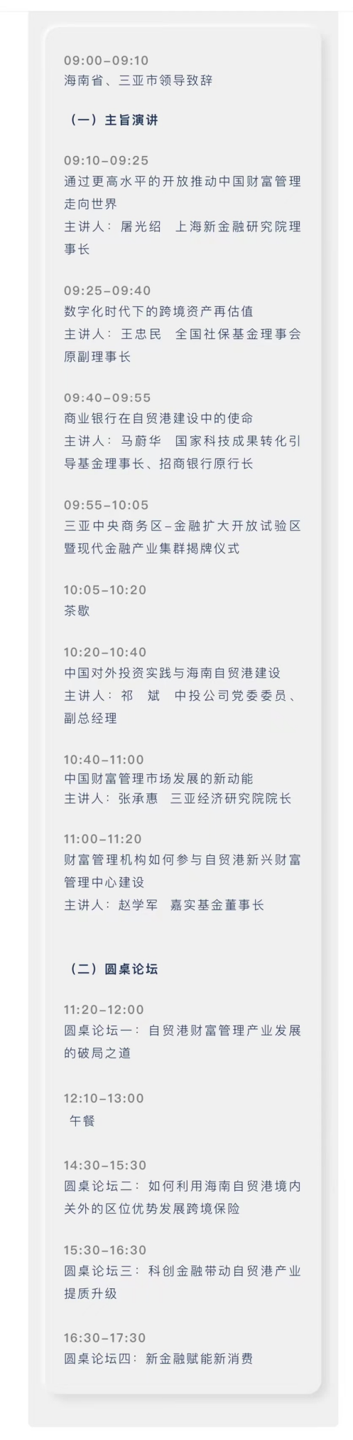 据介绍,此次峰会将围绕中央金融工作会议后海南自贸港金融产业的发展方向、财富管理领域业界普遍关注的问题和跨境资产管理的新动能等话题进行研讨。