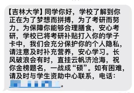 就在考研进入紧张倒计时的这几天,不少吉林大学备考的学生突然发现自己的卡中“凭空”多出了500—1000元不等的金额。带着疑惑询问后才得知,这是学校默默的暖心之举——为了保障学生合理营养用餐所发放的“考研伙食补贴”。据了解,吉林大学通过前期摸排,按照重点经济观察对象1000元、一般经济观察对象500元的标准,给1000余名符合条件的考研学生发放了补助,让大家没有后顾之忧,安心备考。
