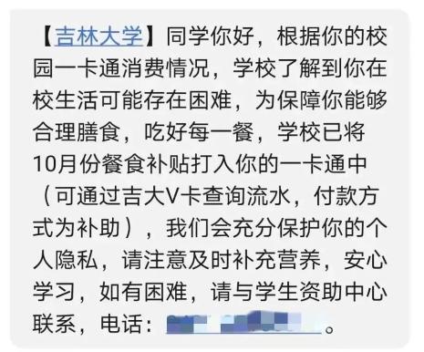 去年,受疫情影响,部分学生的家庭经济负担较重,在倡导勤俭节约优良传统的同时,为进一步保障家庭经济困难学生能够合理膳食、吃好每一餐,吉林大学党委学生工作部就在第一时间与大数据和网络管理中心协调联动,通过调取9月至11月家庭经济困难学生一卡通消费轨迹及总消费金额,并根据每月内有20天以上均在学校食堂消费的学生的一卡通消费数据测算,按照补助100—500元不等的原则,分层次、分阶段补贴家庭经济困难学生。