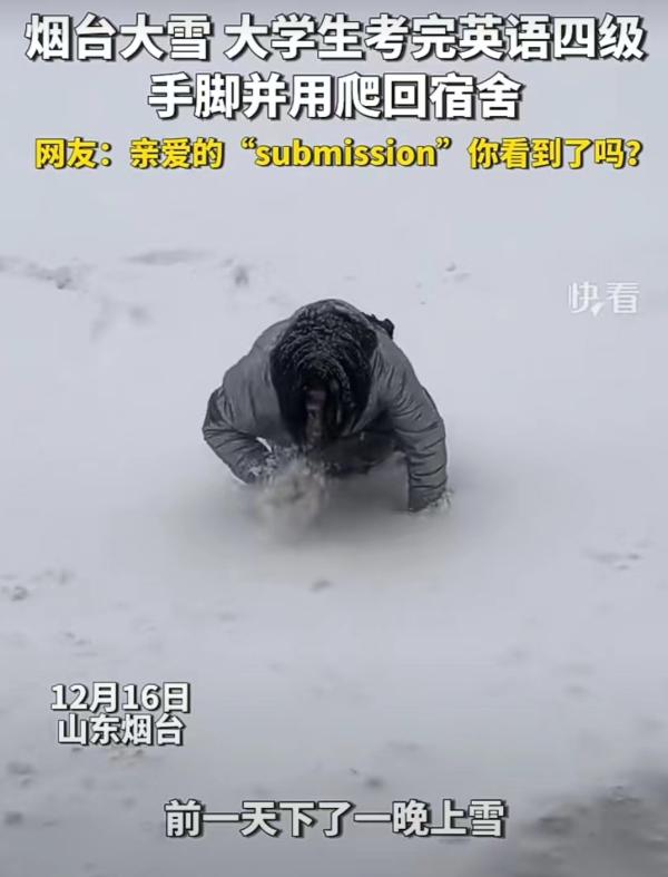 四级考试当天,中国北方地区大雪扑簌簌地落下,有视频显示,有的考完四级的大学生手脚并用爬过雪地,爬回宿舍。雪下得正紧,眉头锁得更紧,“林教头风雪山神庙”的悲凉也不过如此吧?网友直呼:我们都“爬”了,亲爱的“submission”你看到了吗?submission怎么就让大学生投降了?这些让出题人看了沉默,阅卷人看了流泪的答案,仿佛展现的不是考生的英语水准,而是考生对“英语再生产”的创造力。