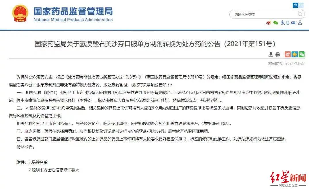 2021年12月,国家药监局发布公告称,将原属于非处方(OTC)的药品(氢溴酸)右美沙芬转为处方药(RX)管理。2022年12月1日,《药品网络销售禁止清单(第一版)》正式施行,其中明确:右美沙芬口服单方制剂被禁止通过网络零售。