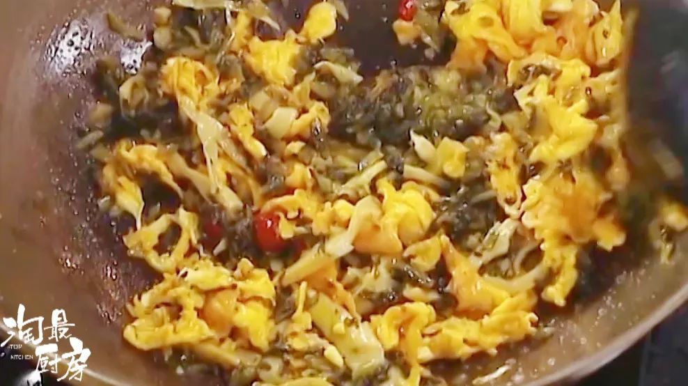 ❷ 将雪菜雷笋倒入锅中,与鸡蛋一起炒香。