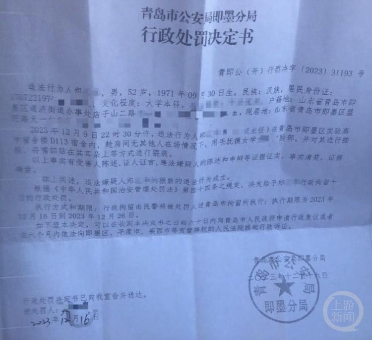 警方的行政处罚决定书。图片来源/网络截图网帖发布者称,她是一名高三女生,就读于青岛市即墨区实验高中。因学校实行寄宿制,自己和另一名同学住一间寝室。12月9日,因室友走读回家,她一人在寝室。当晚22时40分许,班主任郑某某酒后查寝,在其寝室时对她说“男人都是坏人”之类的话,还用手摸她的脸,对她进行搂抱。