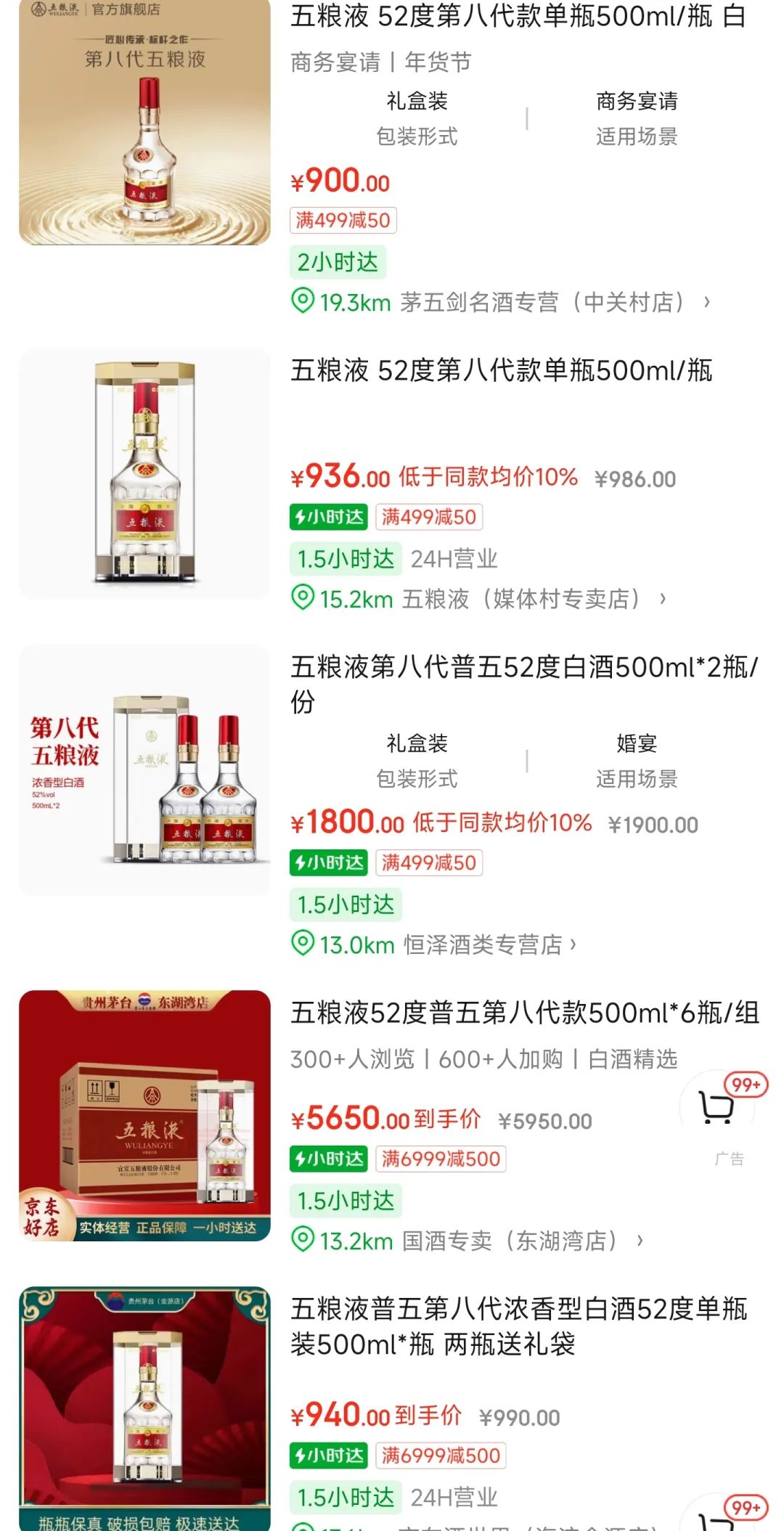 12月18日,「市界」发现,在五粮液天猫旗舰店,第八代五粮液(52度,500ml)的标价为1499元,但是活动后价格为1070元,而在百亿补贴频道的价格为858元;在京东平台,很多店的零售价低于1000元。