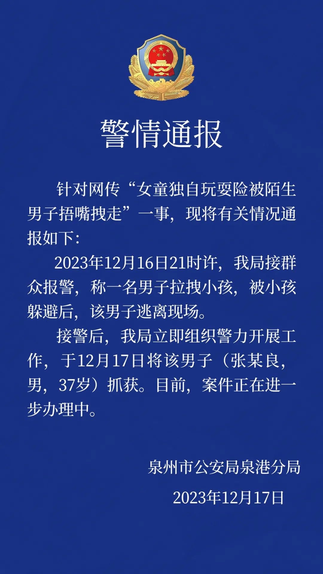 12月16日,有消息称,福建泉州一小女孩独自在家门口路边玩耍时,被一陌生中年男子捂嘴拖拽。