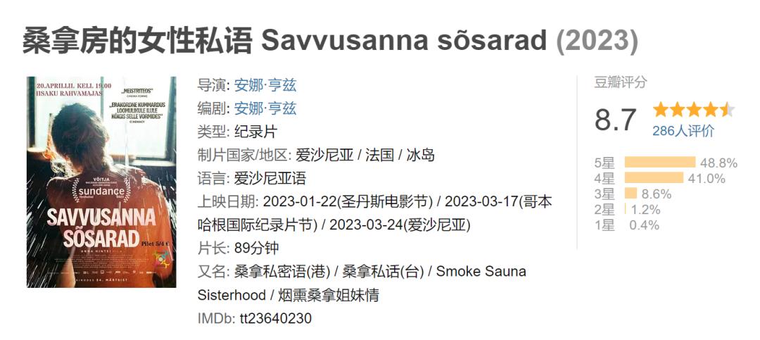 推荐语:爱沙尼亚的桑拿房不仅是清洁身体的场所,也成为了女性坦露内心、彼此疗伤的私密角落。导演将镜头对准桑拿房里女性的身体,狭小的空间之内她们敞开心扉,分享彼此的故事,讲述痛苦的回忆,被水冲刷掉的的不仅仅是身体的污垢,还有不堪回首的屈辱。那些在男权世界受到的不公和伤害只有在这小小的桑拿房里才能得到些许的释放和解脱。《桑拿房的女性私语》绝对是本年度不容错过的女性电影。