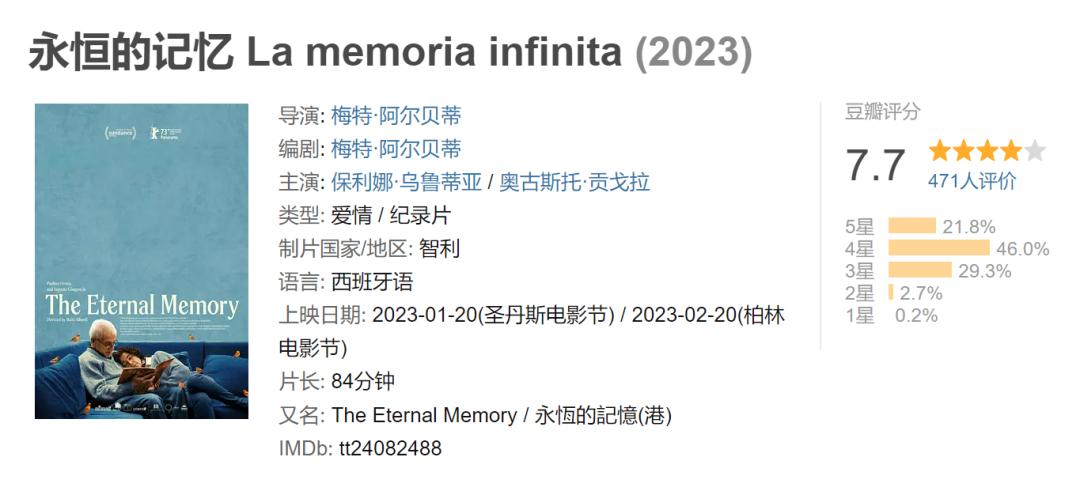 推荐语:本片两位主角是一对恩爱的智利夫妻,他们在年轻时是杰出的记者和演员,如今过着相濡以沫的晚年生活。丈夫罹患阿尔兹海默症,记忆一天天衰退,妻子用爱和包容不断唤醒他的记忆,维系这段感情。然而,这并不是一部只讲爱情的纪录片,全片穿插着丈夫做记者时智利军政府时期的历史画面,重建记忆对这个曾经“被集体失忆”的国家至关重要。个人记忆与集体记忆彼此影响,密不可分,这也是导演在本片切入的最独特的视角。(本片主题曲《La Danza de las Libélulas》真的太好听了!)