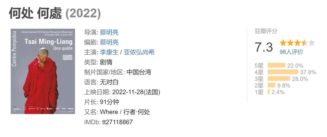 推荐语:蔡明亮导演现阶段的电影创作已经近乎无字天书的境界。在大银幕看这样一部极需耐心的美术馆电影是一种非常特别的体验,当电影抽离掉叙事,当影像越来越纯粹,那种看主流电影的期待会被削弱,同时也在反省自己,电影本就是充满各种可能性的艺术,不要让自己的预设局限了眼界。小康的慢走长征意味着为什么?何处才是终点?并没有一个明确的答案,但我愿意一直看着他走下去。电影的最后响起姚莉的《重逢》,人生何处不相逢,相逢犹如在梦中,余韵无穷。(《何处》的幕后纪录片可见条目《Sing Love Song》)