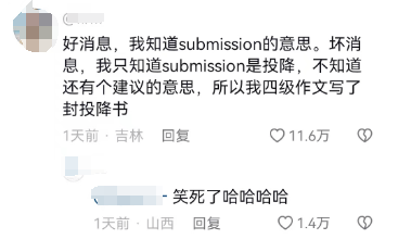 据网易有道词典昨日公布,16日考试当天“submission”单日查词量高达110万次,而前一天该词搜索量仅为1930次,环比增长高达57266%!这意味着,至少有一百万考生没有参透这个单词,吃了眼前亏的大学生们纷纷哀叹“相见恨晚”“心碎一地”。