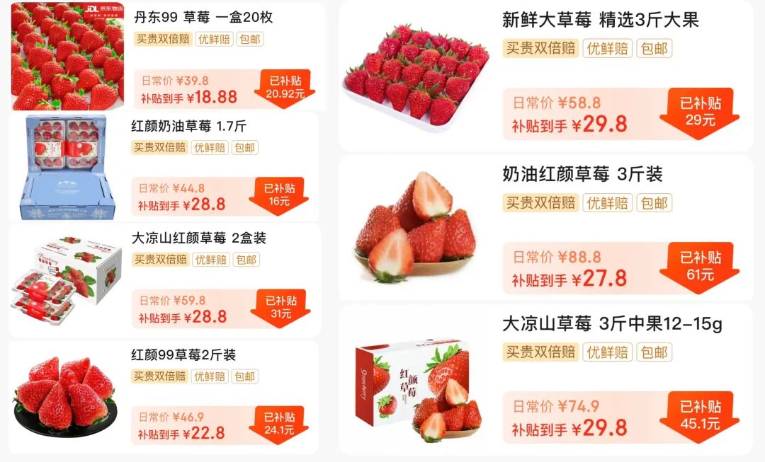 康乐乐的草莓自由是电商平台的百亿补贴给的,前两天她刚收到了一箱3斤装的草莓,总价不到30元,算下来一斤只要9.9元。“我原本是抱着试试的态度购买的,想着即便有个别坏的也还算值,没想到草莓不光用上了保温箱,每一颗尝完都还挺甜的,我刚刚又下了一单。”
