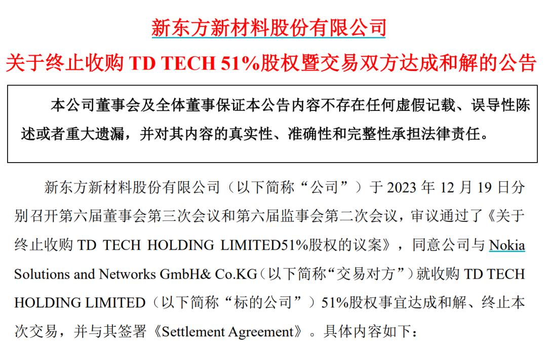 公告显示,东方材料董事会于12月19日审议通过了《关于终止收购 TD TECH HOLDING LIMITED51%股权的议案》,同意公司与诺基亚就收购 TD TECH51%股权事宜达成和解、终止本次交易,并与其签署《Settlement Agreement》(和解协议)。