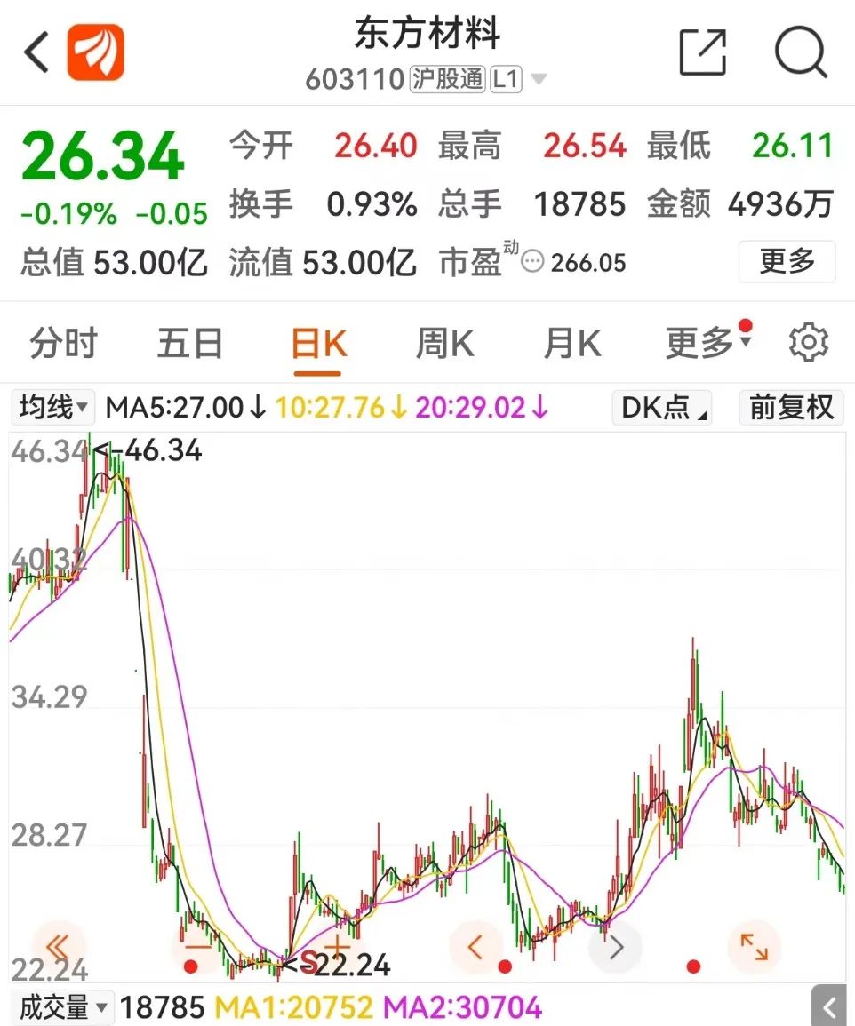 此后,东方材料股价遭遇“腰斩”,从收购前股价最高点46.34元/股,一度下跌至22.24元/股。