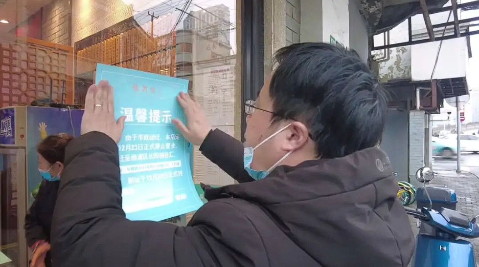 中午时分,上海德兴面馆有限公司副经理王丰将早就准备好的两张“温馨提示”,醒目地贴在店面的玻璃窗前,上面写着“由于市政动迁,本店定于12月23日正式停止营业”等字样。