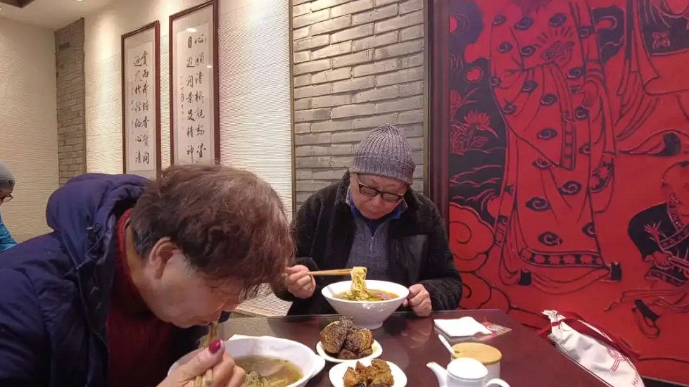 这位嗦着面条的沈老伯,退休前就在附近上班,习惯午饭在这家店吃碗面解决,这次特意带着老伴一起跑来重温一下当年的记忆,不料就听说店面即将搬迁。他开玩笑地说:“这有点像最后的晚餐,特地来告别145年历史的德兴馆,所以多叫了一点浇头,回味回味以前的味道。”
