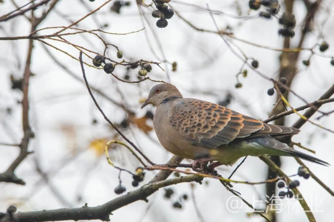 珠颈斑鸠属于鸽形目鸽鸠科鸟类,因此外形和我们饲养的鸽子相似,同时会发出“咕咕咕”的声音。在上海还生活着山斑鸠,它的外形和珠颈斑鸠相似,但是脖颈处并没有黑白色的斑点,翅膀上羽缘红褐色,纹路感更强。