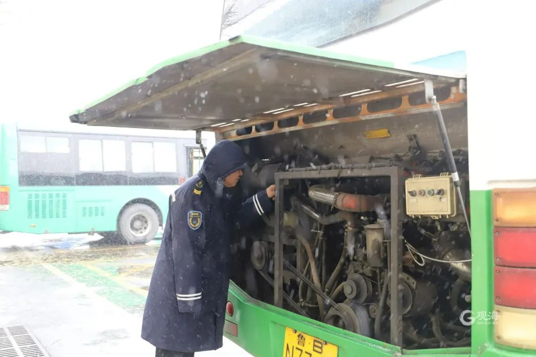 早上7时,冒着漫天的大雪,市北巴士第七分公司维修工班长王刚带领组员打开车后盖,对新能源车辆的防冻液进行检查,在此之前,他已对车辆完成车灯、雨刷、制动性能等方面的例行检查。市北巴士第七分公司安全技术副经理乔正顺介绍,在维修物资库里,准备了充足的防滑链条和融雪剂等防寒物资,每隔一个小时,就会有维修工前往容易积雪的路段进行检查、清雪。同时,分公司组建了一支24小时待命的应急抢修队,对降温可能造成的车辆故障及时进行维修,确保乘客安全出行。公交集团隧道巴士公司提前对全体驾驶员进行雪天驾驶技能培训,每一辆公交车驶出场站前,安全人员都提醒驾驶员安全行车、文明行车,注意防滑路段。下一步,将安排人员及时巡查危险路段的雪情路况,切实关注路面湿滑结冰带来的行车影响,以高度的责任感、紧迫感、使命感全力保障车辆有序运行,为广大市民雨雪降温天气的安全出行保驾护航。