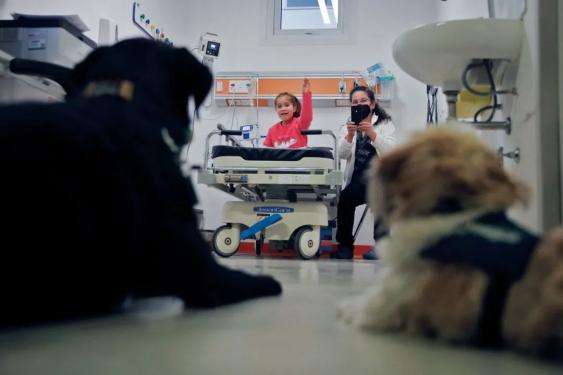 2021年7月28日,智利圣地亚哥。儿科医院的治疗犬为术前儿童缓解焦虑情绪。(图/视觉中国)