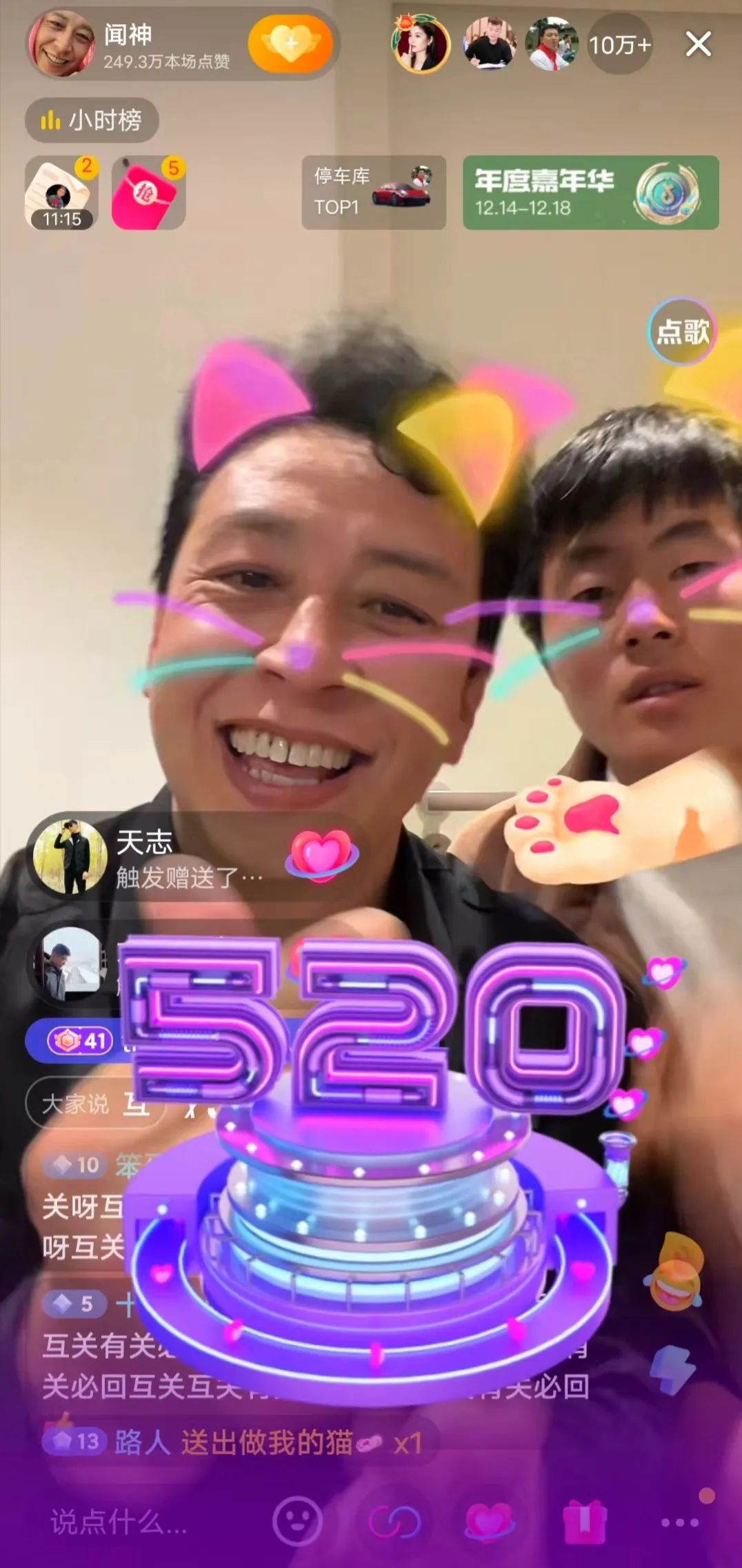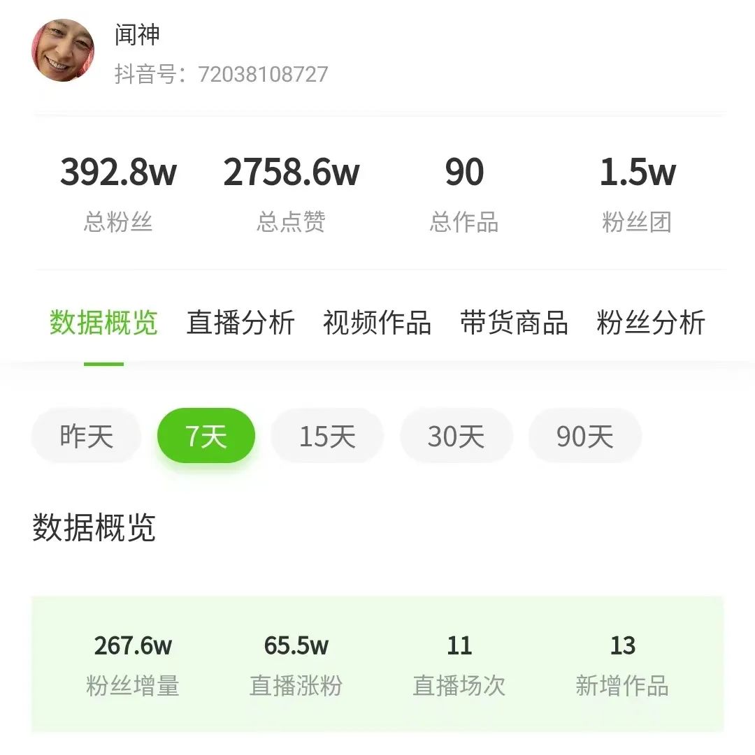 飞瓜数据显示,12月18日至20日,闻会军与儿子通过“闻神”账号四度开播,7天内粉丝增长267.6万,直播涨粉65.5万。其中,12月18日两场直播观看人次均已突破2000万,19日数据则超3000万。而此前“闻神”的直播观看人次在几十万左右。走红意味着流量的暴涨,流量与变现直接挂钩。12月18日开播,“闻神”直播间同时在线人数迅速冲向10万,19日同时在线人数峰值达到60万以上,礼物特效在屏幕上持续闪现,与此前秀才和一笑倾城之间的PK不遑多让。