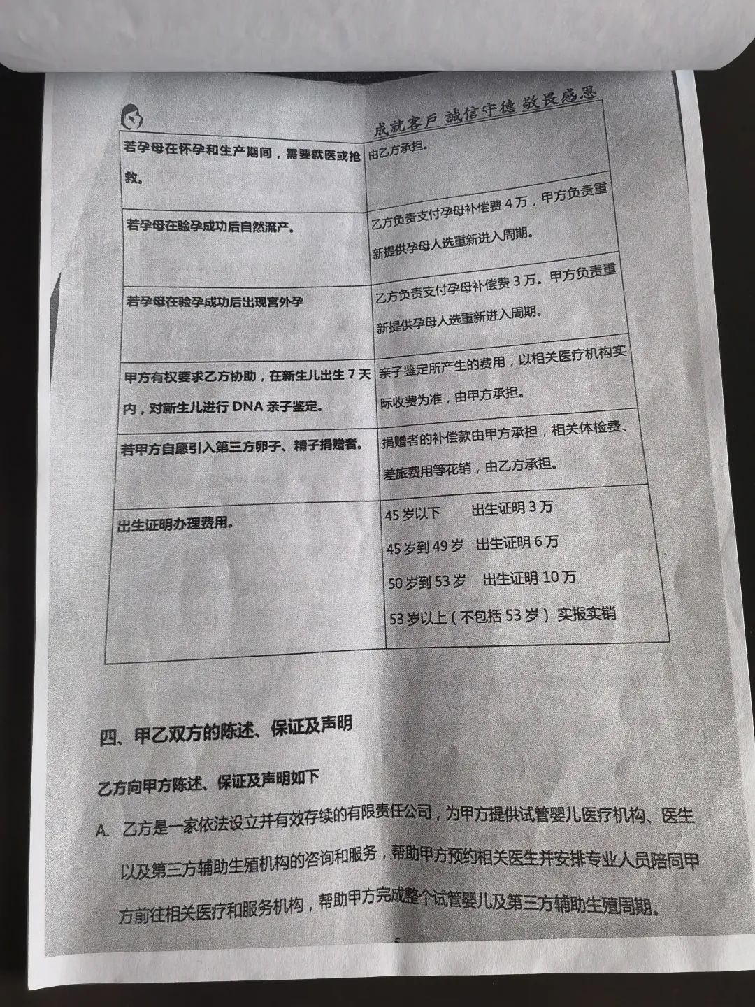 记者还找到了一份今年六月星回公司与柳州客户叶女士签订的“辅助生殖协议”,明确注明了整个代孕过程中所需各项费用。其中,最后一项费用为:出生证明办理费用,不同年龄的客户费用不尽相同:45岁以下客户,出生证明办理费用为3万元;45岁到49岁客户,出生证明办理费用为6万元;50岁到53岁客户,出生证明办理费用为10万元;53岁以上客户,则实报实销。